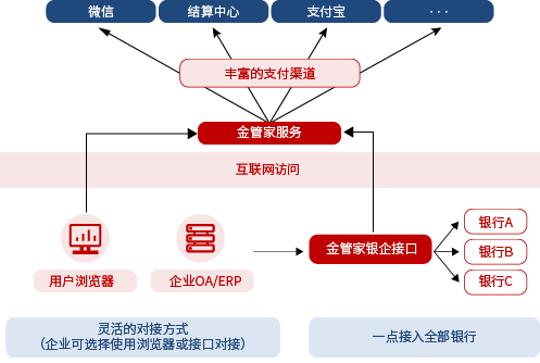 企業(yè)可以根據(jù)實(shí)際需求通過WEB方式或通過API方式接入。通過WEB接入方式,企業(yè)只需要使用普通辦公電腦或平板電腦即可接入使用。通過API方式接入方式,企業(yè)可以實(shí)現(xiàn)ERP、財(cái)務(wù)系統(tǒng)直接對(duì)接金管家系統(tǒng)獲取賬戶數(shù)據(jù)及下達(dá)交易指令。